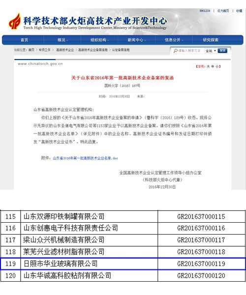 根據(jù)全國高新技術(shù)企業(yè)認定管理工作領(lǐng)導(dǎo)小組辦公室《關(guān)于山東省2016年第一批高新技術(shù)企業(yè)備案的復(fù)函》,我公司被認定為“國家級高新技術(shù)企業(yè)”。
